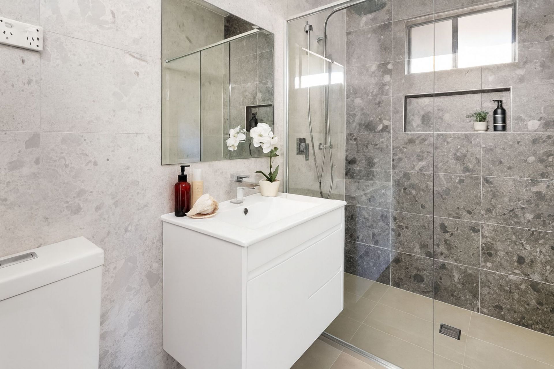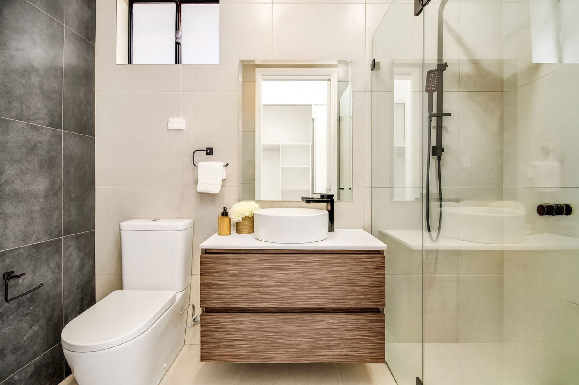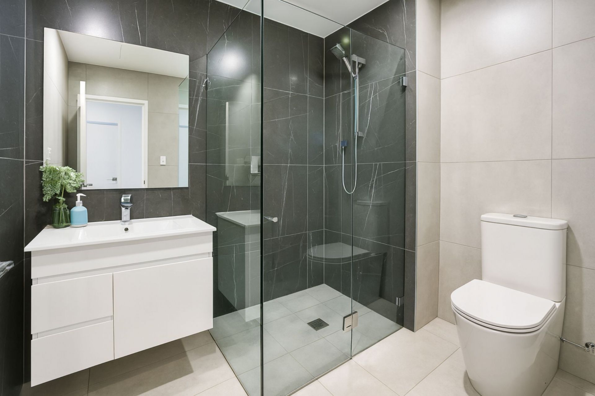 – Elegant main bathroom featuring floor-to-ceiling tiles and oversized shower.