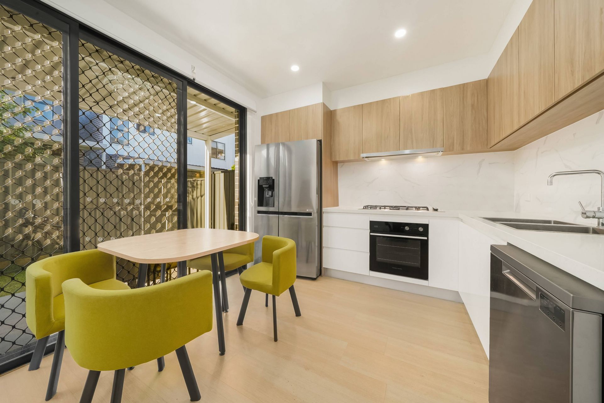 – Modern kitchen with 40mm stone benchtops, gas cooktop, stainless steel appliances (including dishwasher/oven), and soft-closing cupboards