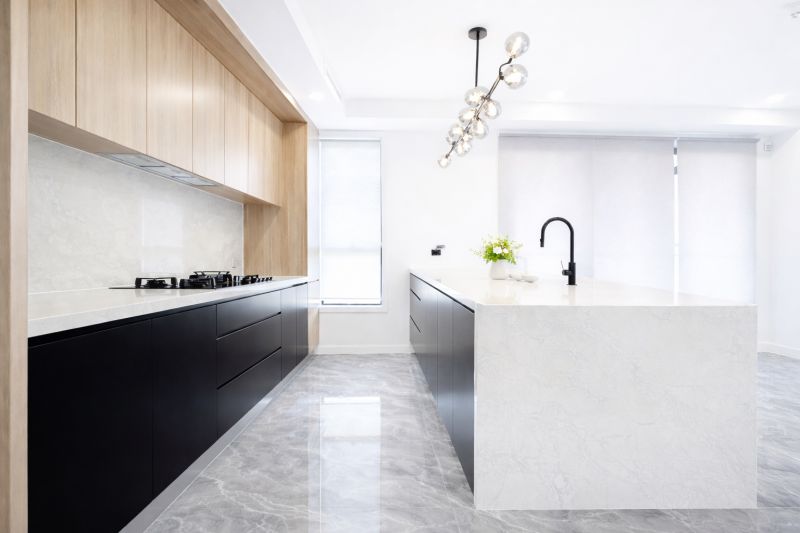 – Modern Kitchen: Stone benchtops, gas cooking, Fisher & Paykel stainless steel appliances, and ample storage.